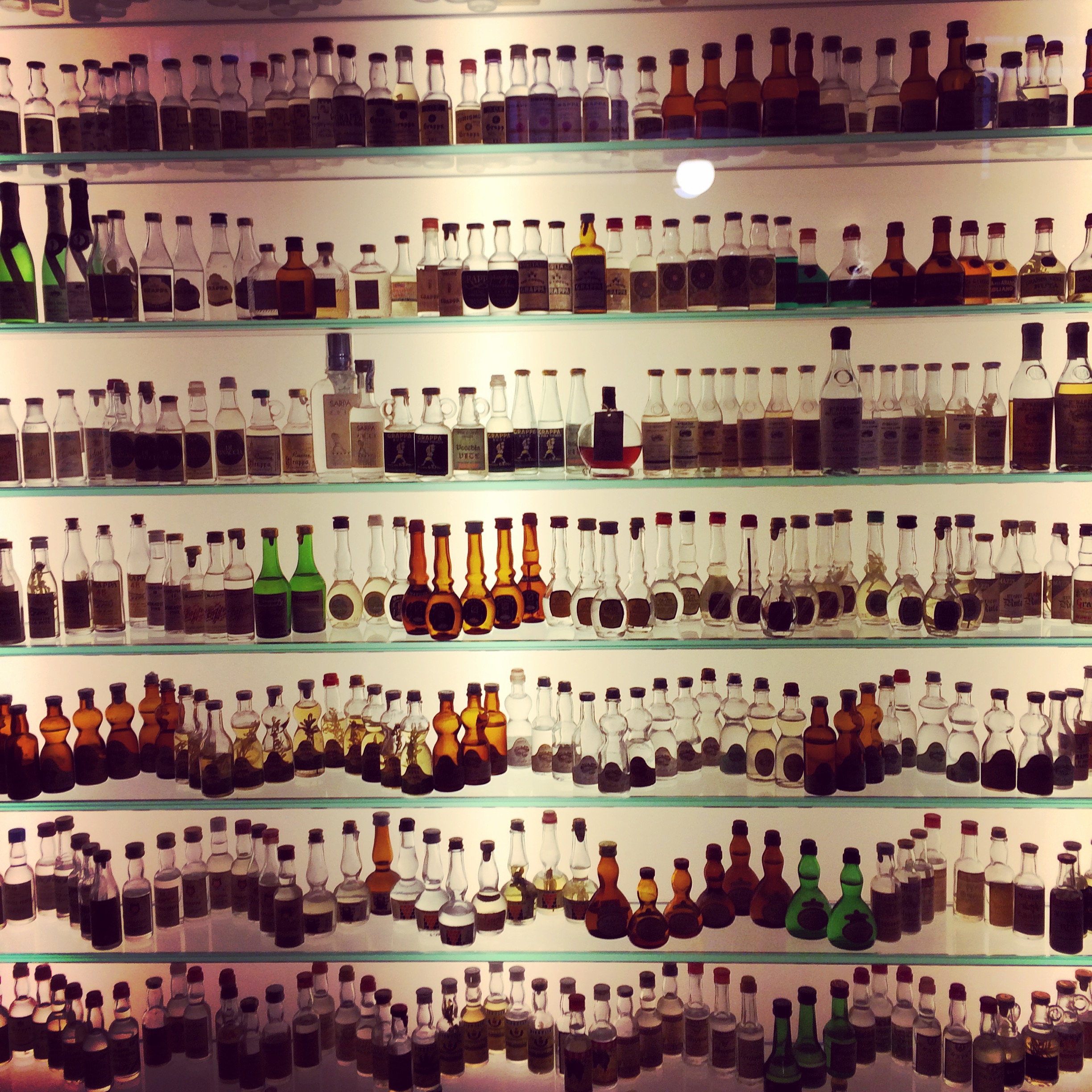 Collection of mini grappa bottles at Poli Museum